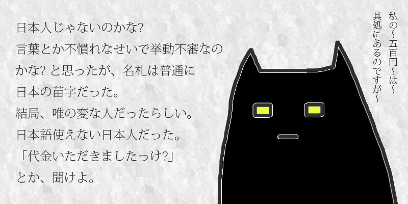 それで、「500円払ったんですけど」って言ったら、ようやく「自分はお金を受け取って此処のとりあえず置いておくくぼみに置いたんだ」って言うの認識したらしくて、ちゃんとお釣り返してくれたんですけど、あれ黙ってたらどうなったんだろう。