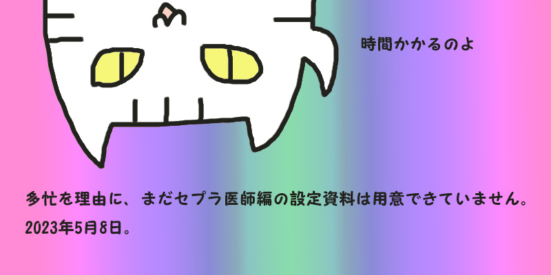 そう言えば、セプラ医師編の設定資料投稿するのをすっかり忘れていました。今日はもう眠たいので、眠って起きてすっきりしてから資料を揃えて提示します。