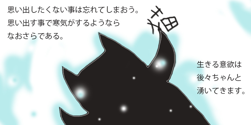 おいどんの中で、「母親像」と言うのがすごく悪くなっているためか、今にも取り殺されそうになっている。具体的には、食欲がなくなり、体力がなくなり、生きる気力がどんどん減って行っている。