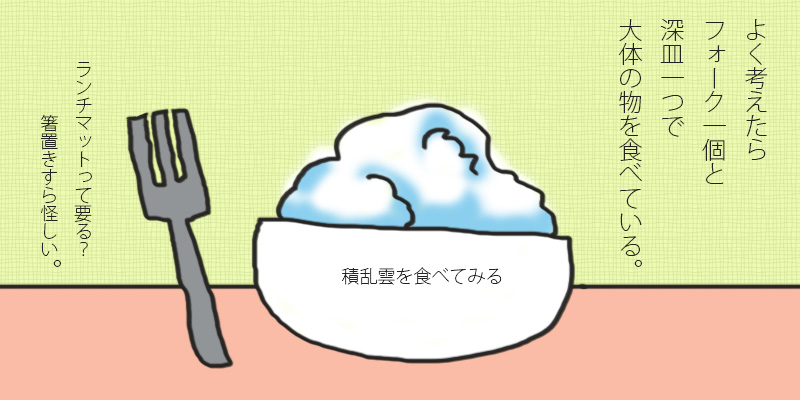 ちゃんとしたご飯と言う物を想像してみたのですが。器とカトラリーが定位置に並べてあって、食べる前に「いただきます」と言うて、これから飯を食べるぞ! と言う気合が入る食卓が良いなぁと。